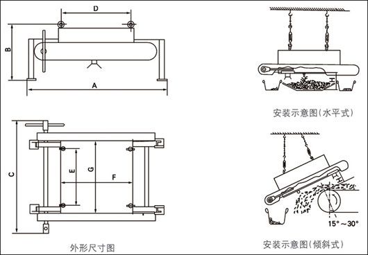 型號 | 適應(yīng)帶寬mm | 額定吊高mm | 磁場強(qiáng)度≥mT | 適應(yīng)料厚≤mm | 重量kg | 懸掛尺寸 D×E mm | 外形尺寸 mm | 磁系尺寸 mm |