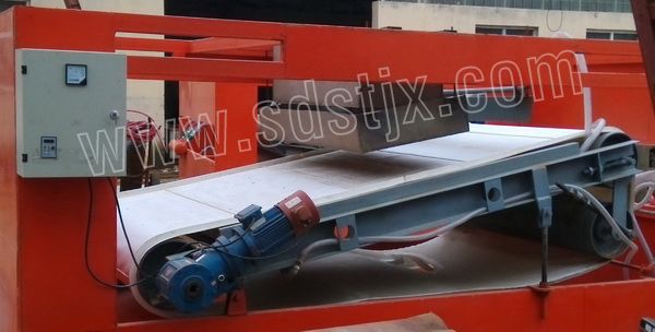 礦漿通過(guò)入料管道進(jìn)入本磁選機(jī)的均勻布料裝置,經(jīng)過(guò)充分分散后被均勻的散落在磁板上部的卸鐵皮帶上,在重力作用下漿料沿磁板的傾斜方向向下流動(dòng),漿料中含有的磁鐵性物在磁棒提供的強(qiáng)磁場(chǎng)下,被牢牢的吸附在卸鐵皮帶上,電機(jī)傳動(dòng)裝置驅(qū)動(dòng)卸鐵皮帶沿磁板傾斜方向向上運(yùn)動(dòng),同時(shí)將吸附的鐵磁性物帶入卸鐵區(qū)域,被卸鐵水管沖洗水沖入尾礦斗中被集中收集,無(wú)磁性漿料繼續(xù)沿磁板向下流動(dòng),流入精礦斗被集中收集。