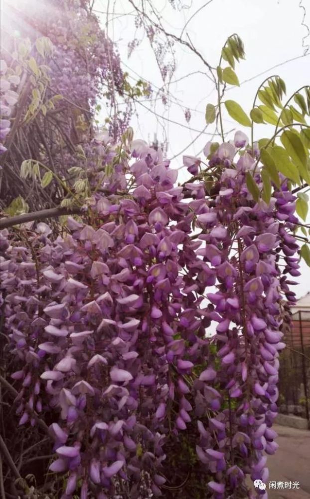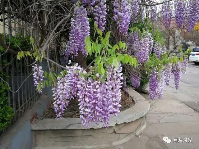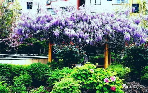 忽見南面一架盛開的紫藤花,穗穗花兒開的正酣,從高處垂到地上,儼然一紫色瀑布!這花清新脫俗,幽雅而不清冷。架下兩口大缸,芙蕖剛露水面,幾尾小紅魚,見我靠近,羞澀的沉下水去?;蛟S氣溫和光照的關(guān)系,南區(qū)的牡丹花尚未開放。過不了幾天,這兒定是花枝招展,萬紫千紅!
