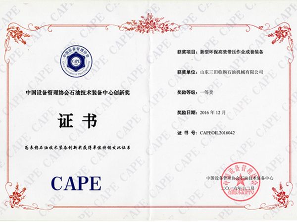 中國設(shè)備管理協(xié)會石油技術(shù)裝備中心創(chuàng)新獎一等獎證書