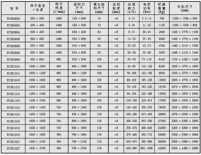 注:破碎石灰石等脆性物料,進(jìn)料粒度≤30-80mm,在保持上表產(chǎn)量不變的情況下,電機(jī)功率將提高一檔,出料粒度≤1mm,可達(dá)80-90%。